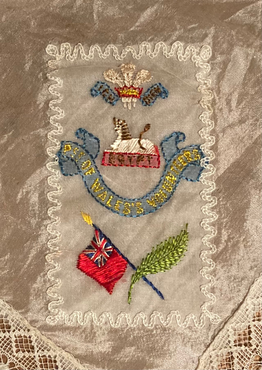 WW1 Silk Embroidered Sweetheart Handkerchief Egypt Prince of Wales Volunteers Military Memorabilia